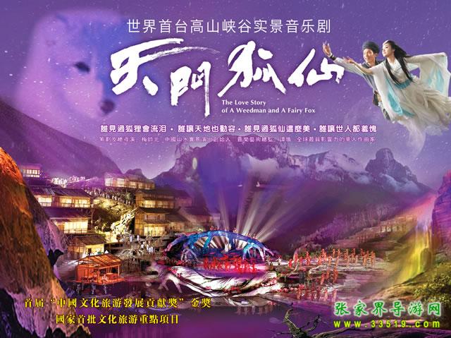 氣勢磅礴的山水舞臺、唯美絢麗的燈光特效、美輪美奐的音樂舞蹈,配合取材于湖南花鼓戲《劉海砍樵》的感人劇情,《天門狐仙》演出讓現場觀眾如癡如醉。該劇投資1.2億元人民幣,由中國山水實景演出創始人、《印象·劉三姐》等劇制作人梅帥元擔任策劃及總導演,全球最具影響力的華人作曲家譚盾擔任音樂藝術總監,2008北京奧運會開、閉幕式執行編導閔銳擔任執行導演,以天門山壯美瑰麗的奇峰險壑為背景,通過頂級配置的燈光、音響、舞臺機械、數碼影像等設施,呈現出一場氣勢恢弘、如夢似幻的藝術盛宴。這是世界上第一臺以高山奇峰為舞臺背景,以山澗峽谷為表演舞臺的山水實景演出,也是目前世界第一臺有完整故事情節的山水實景音樂歌舞劇,其豐富的音樂文化元素和表現形式,令人嘆為觀止。