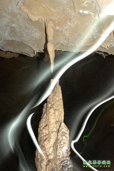 在這兒向您介紹一點溶洞學(xué)的知識。在溶洞中,自洞頂往下生長的叫石鐘乳,自洞底往上生長的叫石筍,兩者相向生長連在一起就叫石柱,三者統(tǒng)稱為鐘乳石。這兒有一根石鐘乳與一根石筍是相對生長的,差一點點就要連起來了,但他們卻永遠(yuǎn)不能合在一起,因為上面的石鐘乳已經(jīng)沒有滴水,已經(jīng)失去了生命力。這好像一對苦苦守望的情人,近在咫尺,卻永遠(yuǎn)不能相逢。于是人們便給他們?nèi)×艘粋€非常動人的名字——恨難逢。“盈盈一水間,脈脈不得語。”“天涯海角有窮時,只有相思無盡處。”在無數(shù)個春去秋來的日子里,他們該有多少離愁別緒啊!——真不知道是石頭多情,還是人多情?——而有的人說得很樂觀,“兩情若是長久時,又豈在朝朝暮暮”,所謂“距離產(chǎn)生美”嘛。