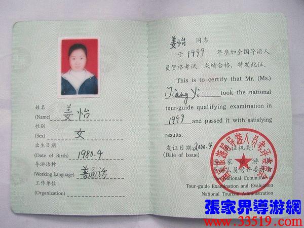 | 姜怡,女,導游員資格證書編號:Hun990125。 大專學歷,自99年9月森林保護節前開始從事導游工作,同年十二月參加全國導游員資格考試,并以優異成績取得“國導證”,現為張家界華天國旅旅行社的專職導游員。整個帶團期間,無論團隊或散客,未出現一次旅游事故或游客投訴事件,普遍反映帶團效果好。 | 導游自述