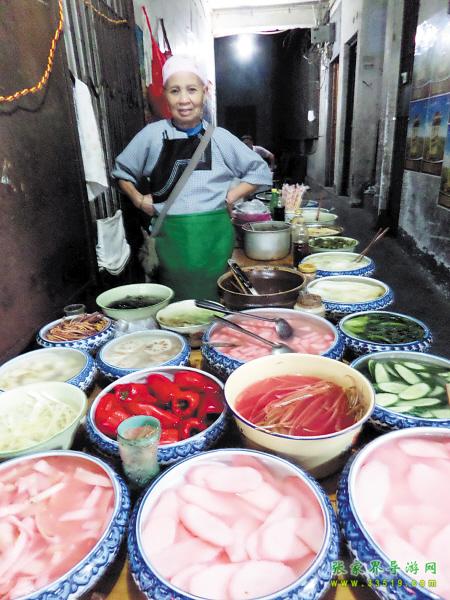 鳳凰本地人介紹好吃的,總是推薦姜糖、獼猴桃等,事實上,當地小巷深處的泡菜同樣令不少游客贊不絕口。酸酸的泡菜可以是豆角,也可以是當地特有 的紅心蘿卜、刀豆、包菜、涼薯等,這些都可以成為泡菜原料,每種原料用陶缽盛著擺在架子上。想吃什么,自己用筷子夾了放一起。過完秤,可以根據自己的喜好 放辣椒粉或白糖拌(辣椒粉還分微辣、猛辣),往旁邊小桌上坐下,邊吃邊看著古街上那些匆匆而過的游客,那種感受絕不亞于在國外街頭喝咖啡賞景。
