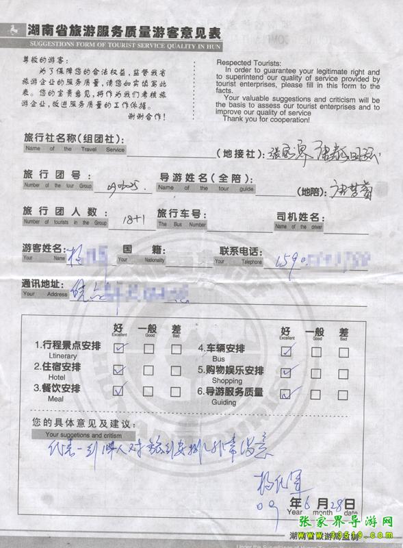 2009年6月25日安徽楊先生一行18人接待質量反饋表:
