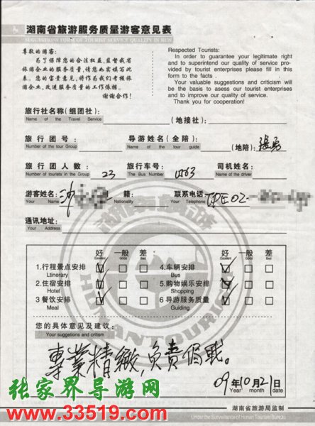 2009年10月18日沙先生一行23人接待質量反饋單: