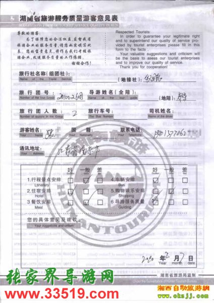 2010年2月7日江蘇張小姐一行2位旅游質量反饋