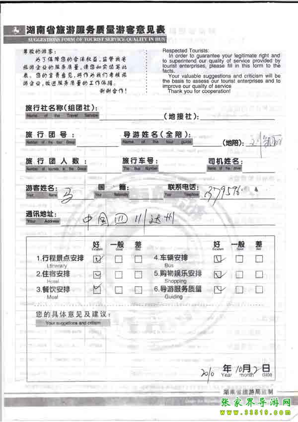 2010年10月2日四川馬先生一行17位旅游質量反饋