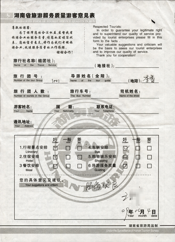 2009年10月1日王先生一行質量接待反饋單:
