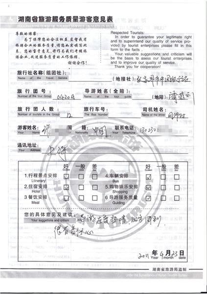 2011年4月23日張先生旅游質量反饋:導游態度熱情,服務周到,很有責任心