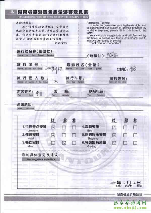 2010年8月2日曾小姐一行5位旅游質量反饋