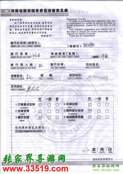 2010年7月5日黑龍江吳先生一行5位旅游質量反饋