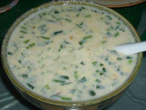 將用水浸泡過的黃豆用磨子磨碎,摻入切細的青菜葉,然后用溫火煮熟即可。此樣菜雖做法簡單,但營養價值極高且味鮮美,為當地人常用的一道菜。